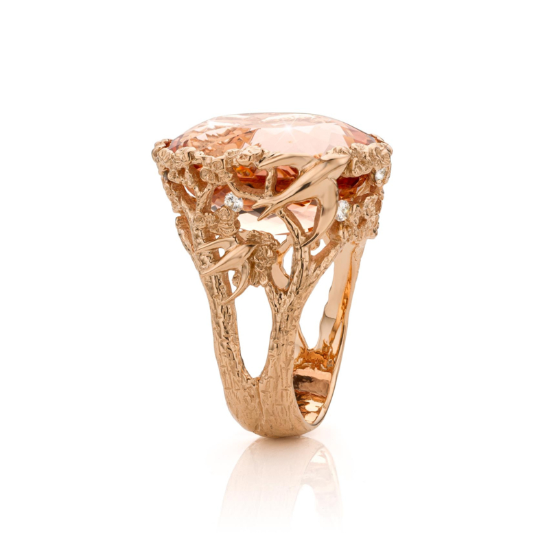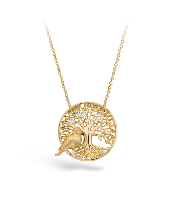 Herinnering aan haar moeder.Deze hanger is gemaakt van rosé goud met een diamantje in het oogje van de vogel. Het collier valt mooi door de vleugels van de vogel heen waardoor er geen los hangeroog nodig is wat afbreuk zou doen aan het ontwerp. De steen is…
